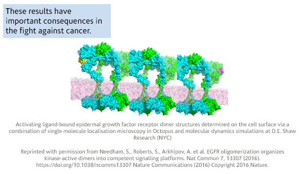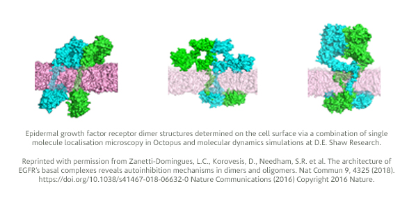 The CLF and King’s College London made a discovery that changed our current understanding of epidermal growth factor receptor (EGFR) autoinhibition, crucial to halt the development of tumour cells. Following on from this research, we used super-resolution and single particle tracking (as used in the previous paper) to understand the elusive structure of key parts of EGFRs.