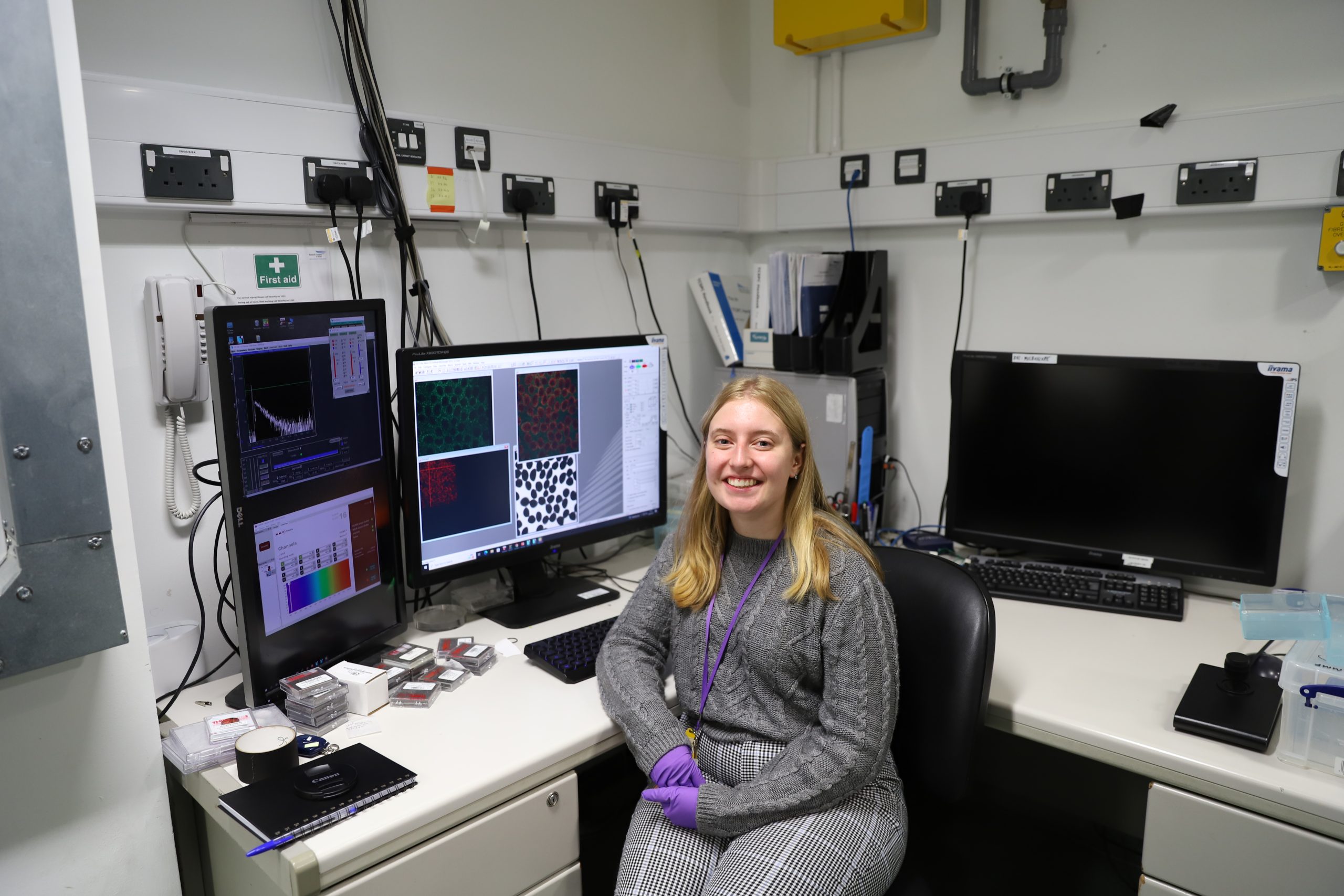 Most of Holly’s days so far have been spent helping users plating up cells, imaging with FLIM (Fluorescence Lifetime Imaging Microscopy) and starting to get measurements for her own mini project on fluorescent molecules in different glycerol solutions. Holly said she feels she is learning so much from this placement and loves how much practical experience she is gaining from being in the lab every day and assisting a variety of users with a broad range of work.