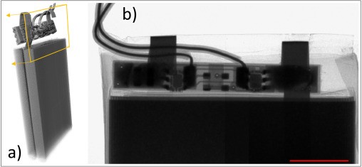 (Tomographic reconstruction of a pouch cell obtained using conventional lab x-ray CT. Manufacturing defects can occur such as delamination of layers, improper electrode attachment, and poor welding in the tab area highlighted (b) Front view radiograph of the tab area obtained with the laser-betatron source. The red line indicates 1 cm.) Image credit: https://www.sciencedirect.com/science/article/pii/S016890022030766X?via%3Dihub