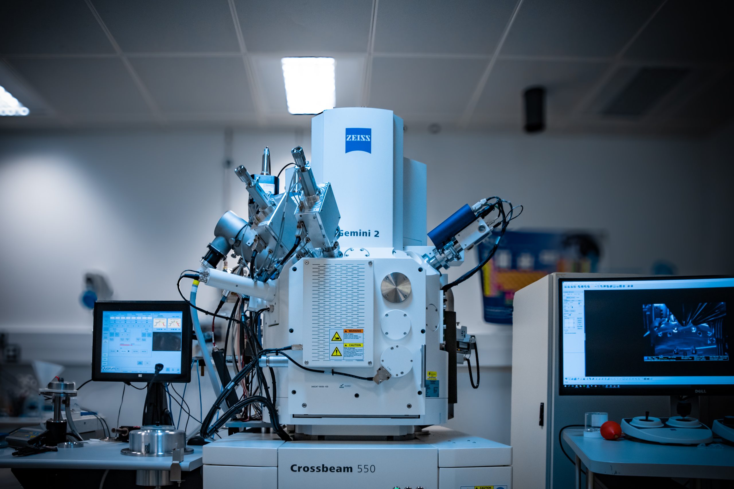 The Zeiss Crossbeam 550XL is a high-resolution FE-SEM equipped with a Gemini II SEM column, a Capella Ga- liquid metal ion (Ga-LMIS) FIB and a Quorum cryo-stage and cryo-prep station with airlock. It is a highly versatile piece of kit which can be used for a range of applications in the life and material sciences, allowing high-resolution SEM imaging at room temperature and in cryogenic conditions. Dual-channel detection is also enabled, allowing surface and material contrast images to be acquired simultaneously.