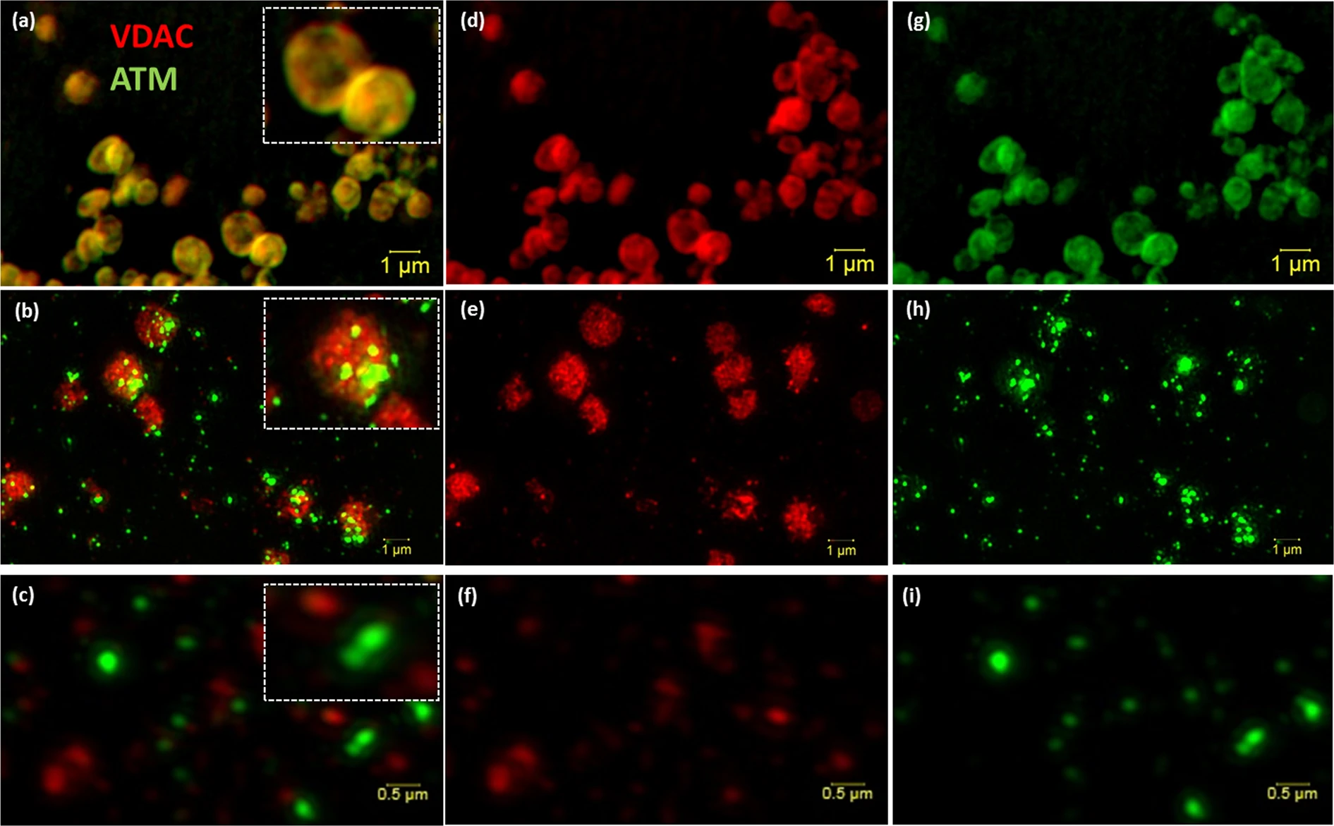 [Super resolution structured illumination microscopy (SR-SIM) of isolated mitochondria and mitoplast preparation. M/S-isolated mitochondria (a, overlay) was probed with VDAC (d; red) and ATM (g; green). (b) (Overlay of e,h) shows the permeabilisation of the outer membrane (e; red) of M/S isolated mitochondria and formation of mitoplasts directly after the addition of 1.2% digitonin (0 min). (c) (Overlay of f,i) represents the formation of mitoplasts after 20 minutes of 1.2% digitonin treatment. Scale bars represent 1 μm in Panel a,b,d,e,g,h and 0.5 μm in (c,f,i).]