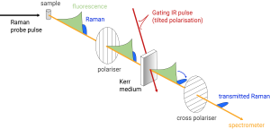 A common problem encountered in Raman spectroscopy is the presence of fluorescence swamping the weaker Raman signal. The Kerr-gated Raman collection system removes fluorescence background enabling measurements of even strongly fluorescing samples. Fluorescence is rejected in the time domain with the Kerr-gate acting as an optical shutter with ~ 4ps time resolution. The gate throughput in the open state is as high as 40% with an extinction ratio in the closed state of ~ 10-5. Currently the Kerr-gate can be operated in the range 300 to 950nm.