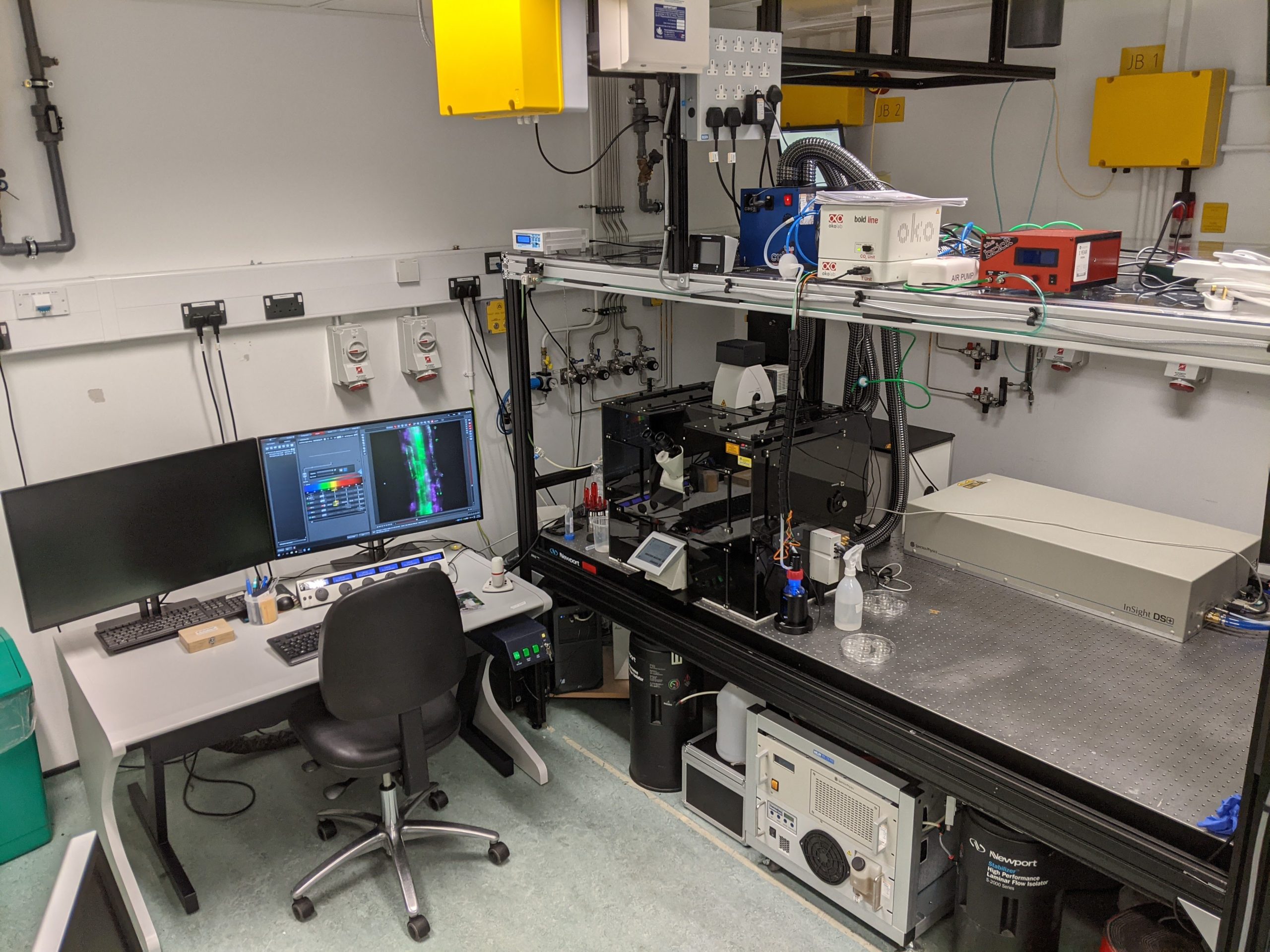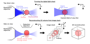 Light sheet microscopy is a fluorescence imaging technique with a growing number of specialised variants, each tailored to specific applications. At Octopus, we use digitally scanned laser light sheets. In this method, a Gaussian laser beam is directed at the sample from a direction perpendicular to the detection axis. The beam is rapidly scanned along the y-axis, much faster than the camera’s exposure time, creating a full plane of illumination that is captured in a single image. By moving the sample through the light sheet, a stack of images can be acquired plane by plane, allowing for 3D reconstruction of the fluorescence signal.
