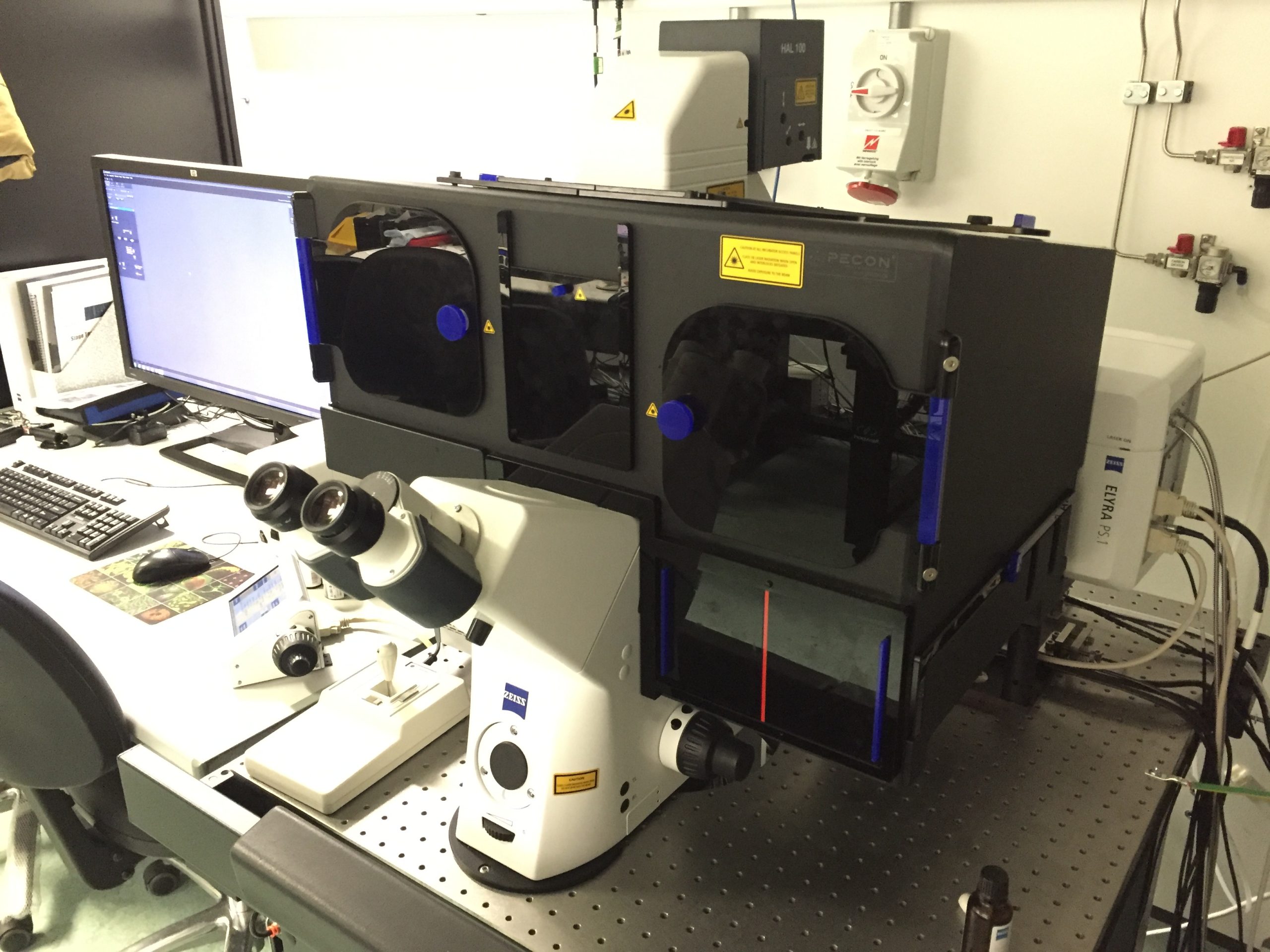 Structured illumination microscopy (SIM) is a method of imaging fluorescently labelled structures at greater spatial resolution than a conventional fluorescence microscope is capable of optical diffraction imposes a limit of approximately 200nm lateral and 500nm axial resolution in the conventional microscope, both of which are doubled in SIM. It involves imaging a grating onto the sample to produce Moiré fringes, which may be resolved in the microscope even if the sample structure cannot be seen directly.